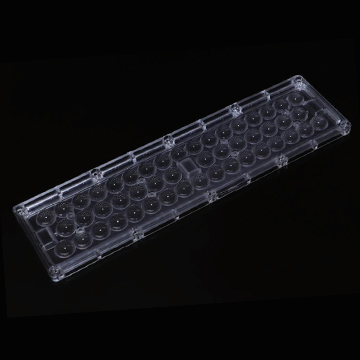 LENTE EM POLICARBONATO DE ALTA TRANSMITÂNCIA, DIMENSÕES 326x90MM, PARA 48 LEDS 5050 FLAT PACKAGE, COM 60° DE ABERTURA MÉDIA DO ÂNGULO DE FACHO, TEMPERATURA DE OPERAÇÃO MÁXIMA 120 °C, RESISTENTE A RAIOS UV, RESISTENTE A IMPACTOS IK >08, VEDAÇÃO CONTRA PARTÍCULAS SÓLIDAS DE ÁGUA GRAU IP66