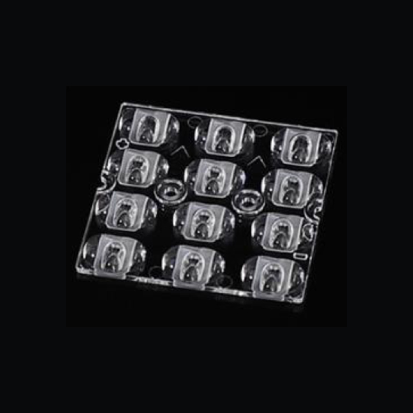 LENTE EM POLICARBONATO DE ALTA TRANSMITÂNCIA, DIMENSÕES 60x60MM, PARA 12 LEDS 5050 FLAT PACKAGE, COM 146°x85° DE ABERTURA MÉDIA DO ÂNGULO DE FACHO, CLASSIFICAÇÃO IESNA TII-M CUT-OFF, TEMPERATURA DE OPERAÇÃO MÁXIMA 120ºC, RESISTENTE A RAIOS UV